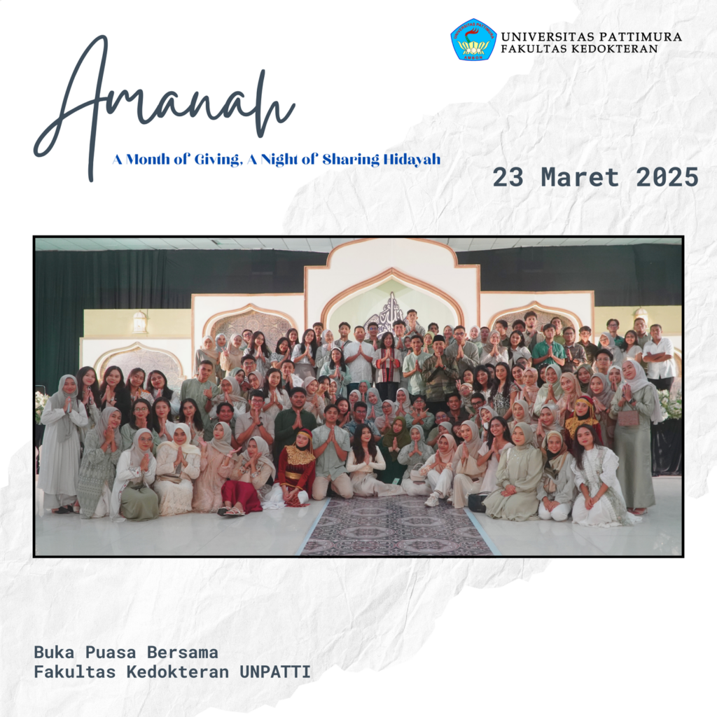 FK UNPATTI melalui Panitia Ifthar 2025 menggelar buka puasa bersama pada Minggu (23/03/2025). Acara yang berbalut tema “Amanah : A Month of Giving, A Night of Sharing Hidayah” ini, dihadiri oleh para mahasiswa, tenaga pendidik dan kependidikan serta alumni FK UNPATTI. Hadir sebagai penceramah adalah Ust. Mardin Wally.