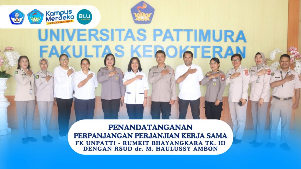 Bertempat di Ruang Dekan Fakultas Kedokteran Universitas Pattimura (FK UNPATTI) pada Senin (20/01/2025) dilakukan penandatanganan perpanjangan perjanjian kerja sama FK UNPATTI – Rumah Sakit (Rumkit) Bhayangkara Tk. III Ambon dengan RSUD dr. M. Haulussy Ambon. Penandatanganan dilakukan oleh Dekan FK UNPATTI, Dr. dr. Bertha Jean Que, Sp.S., M.Kes dan Wakil Kepala Rumkit Bhayangkara, Kompol dr.