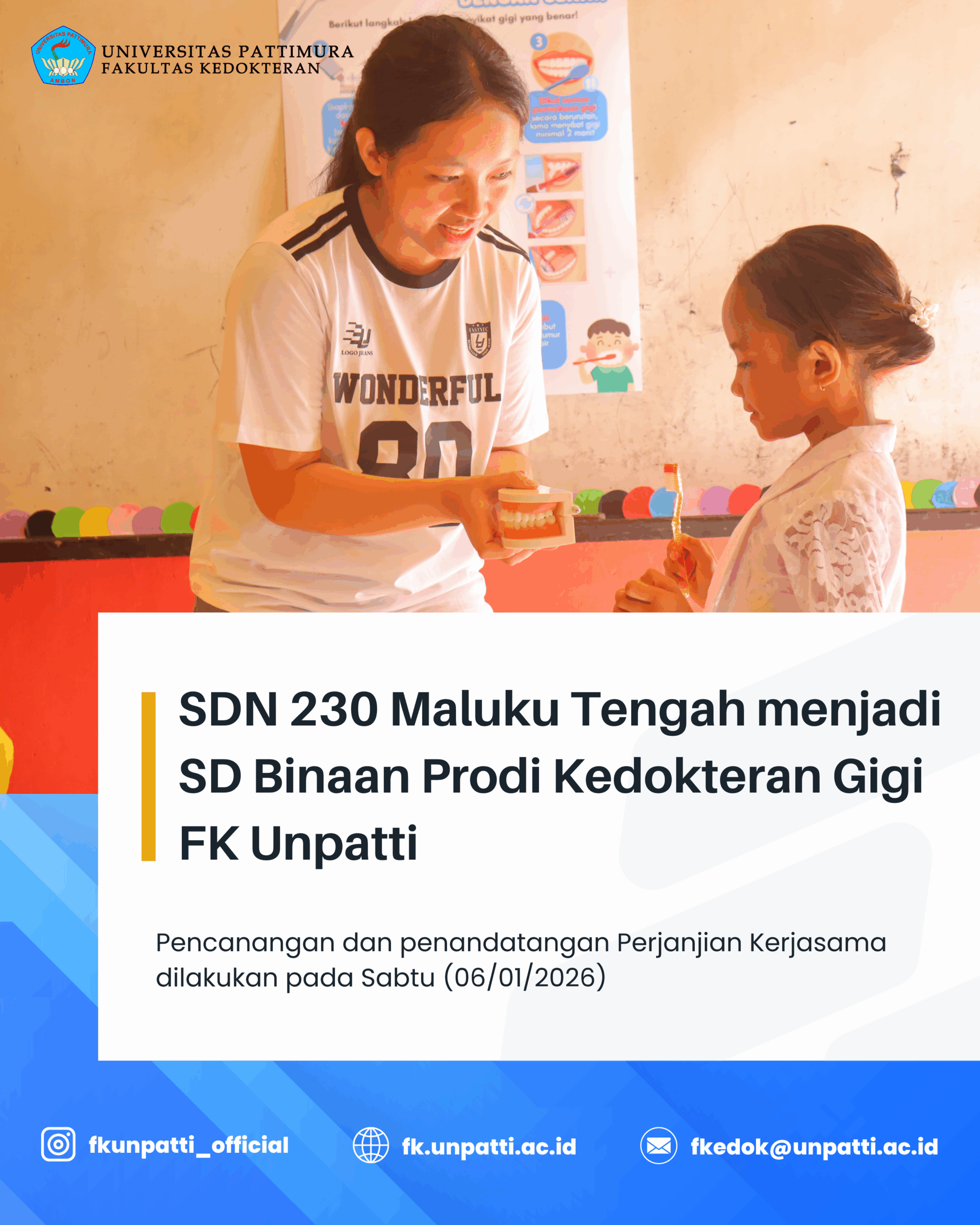 Program Studi Kedokteran Gigi Fakultas Kedokteran Universitas Pattimura (Prodi KG FK Unpatti) mencanangkan SD Negeri 230 Maluku Tengah sebagai sekolah binaan pada Sabtu (10/01/2026) di Desa Hatu, Kecamatan Leihitu Barat, Kabupaten Maluku Tengah.