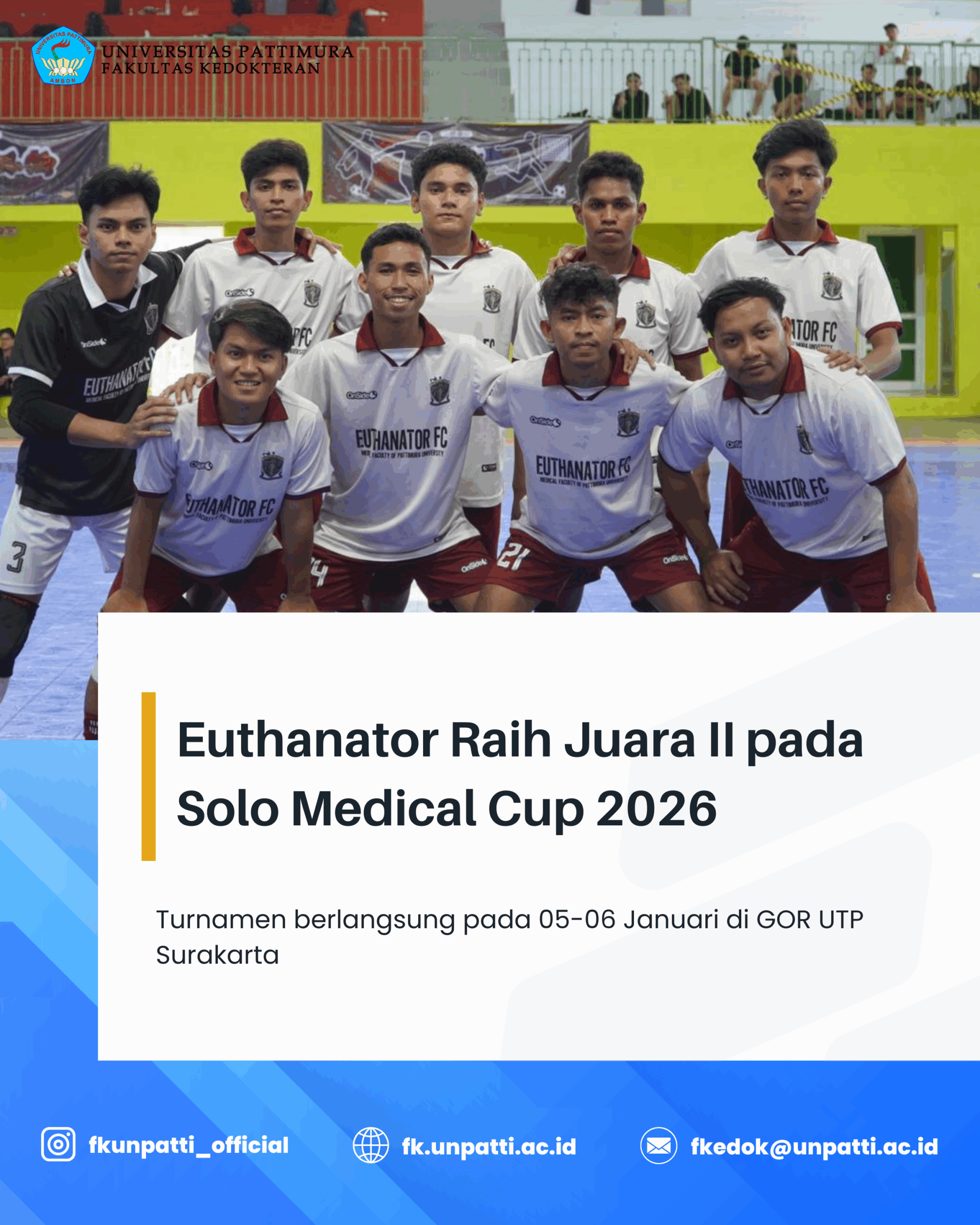 Tim futsal Fakultas Kedokteran Universitas Pattimura (FK Unpatti) Euthanator berhasil meraih Juara II pada ajang Solo Medical Cup 2026, turnamen futsal antar fakultas kedokteran se-Indonesia. Turnamen ini diselenggarakan pada 5–6 Januari 2026 di GOR UTP Surakarta.