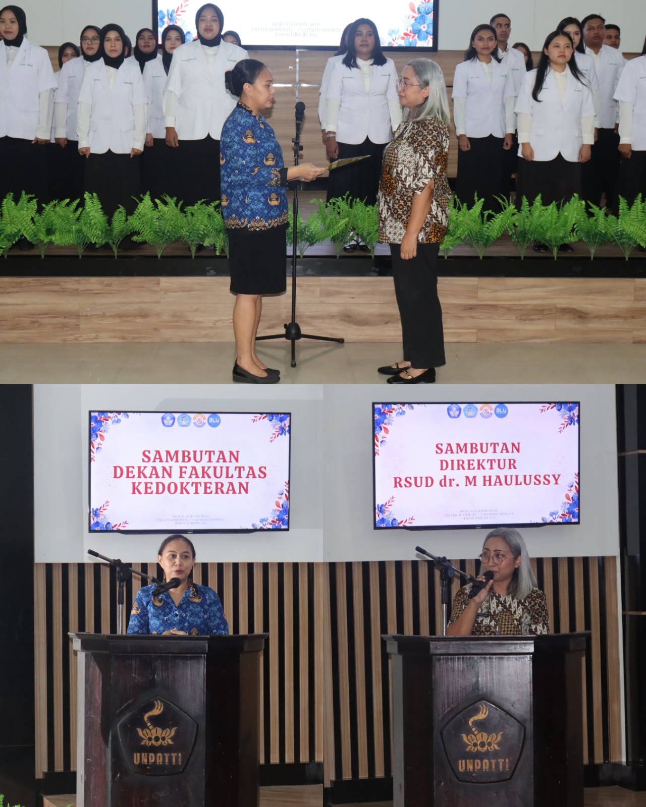Turut hadir Direktur RSUD Dr. M. Haulussy Ambon, dr. Winny N. Leiwakabessy, Sp.PA., M.Kes, yang dalam sambutannya menegaskan bahwa ikrar Janji Dokter Muda merupakan komitmen awal memasuki dunia pelayanan klinis. Ia menekankan pentingnya tidak hanya kecerdasan akademik, tetapi juga empati, integritas, dan tanggung jawab dalam memberikan pelayanan kepada pasien. Menurutnya, rumah sakit tidak hanya menjadi tempat mengembangkan keterampilan medis, tetapi juga membentuk karakter tenaga kesehatan. Dokter Muda diharapkan mampu beradaptasi dengan berbagai tantangan pelayanan kesehatan, termasuk menghadapi penderitaan pasien, ketidakpastian klinis, serta tekanan emosional.