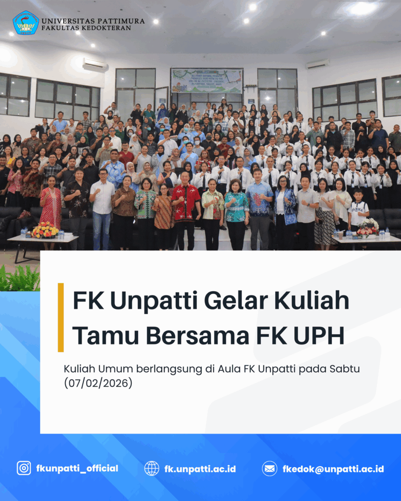 Fakultas Kedokteran Universitas Pattimura (FK Unpatti) menyelenggarakan kegiatan kuliah tamu bersama Fakultas Kedokteran Universitas Pelita Harapan (FK UPH) pada Sabtu (07/02/2026). Kegiatan ini berlangsung di Aula FK Unpatti dan diikuti oleh mahasiswa, dosen, serta para alumni FK Unpatti. Kegiatan tersebut dipimpin langsung oleh Dekan Fakultas Kedokteran Universitas Pelita Harapan, Prof. Dr. Dr. dr. Eka J.