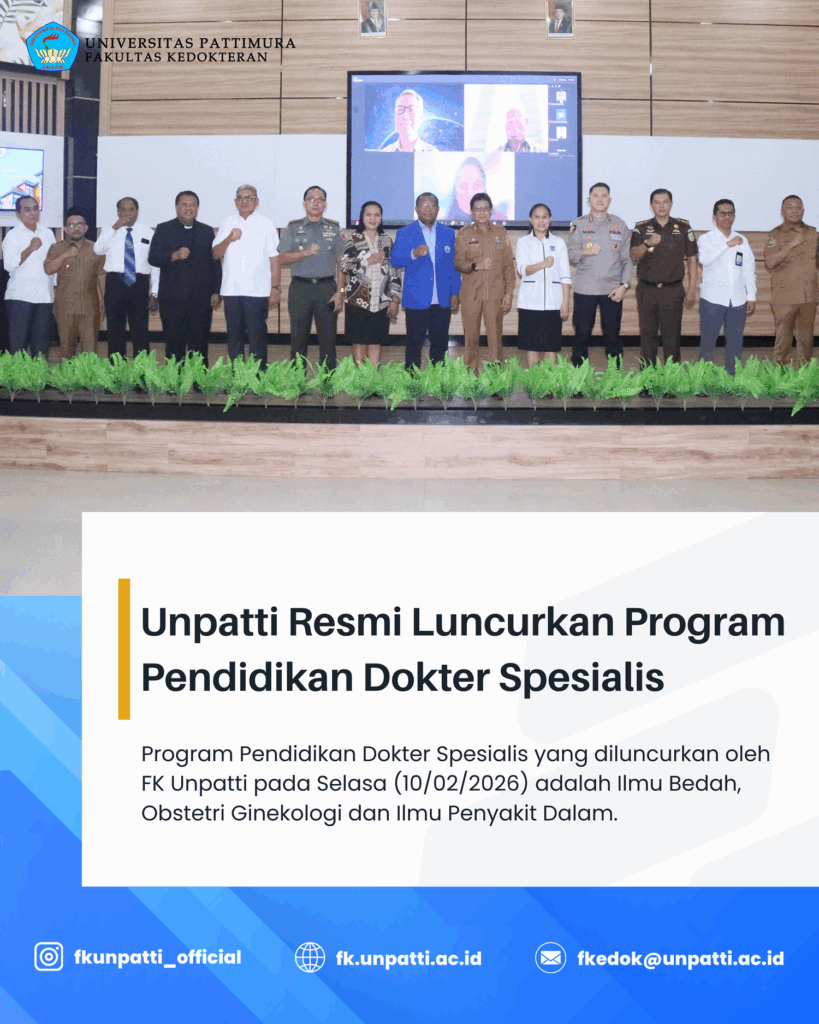 Fakultas Kedokteran Universitas Pattimura (FK Unpatti) Ambon resmi meluncurkan Program Pendidikan Dokter Spesialis (PPDS) pada Selasa (10/02/2026). Kegiatan ini dihadiri oleh berbagai pemangku kepentingan dari dalam maupun luar Universitas Pattimura sebagai bentuk dukungan terhadap penguatan pendidikan kedokteran di Provinsi Maluku. Hadir dalam kegiatan tersebut Rektor Universitas Pattimura, pimpinan pemerintah provinsi, kabupaten, dan kota se-Maluku, serta