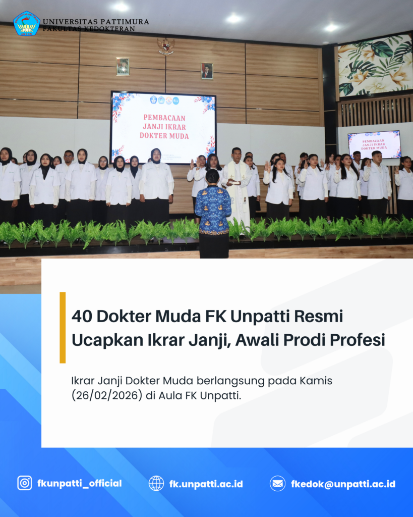 Fakultas Kedokteran Universitas Pattimura (FK Unpatti) resmi melantik 40 Dokter Muda periode Februari 2026 melalui prosesi Janji Dokter Muda yang berlangsung khidmat pada Kamis (26/02/2026). Kegiatan ini menjadi momentum penting sebelum memasuki tahap pendidikan profesi dokter (klink). Janji Dokter Muda merupakan bentuk komitmen moral dan profesional lulusan kedokteran untuk menjunjung tinggi etika profesi, menjaga kerahasiaan