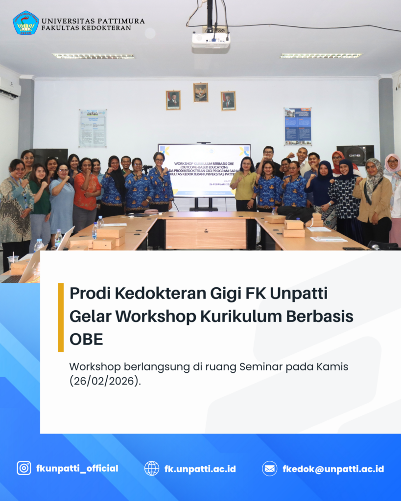 Program Studi (Prodi) Kedokteran Gigi Program Sarjana pada Fakultas Kedokteran Universitas Pattimura (FK Unpatti) menyelenggarakan Workshop Kurikulum Berbasis Outcome-Based Education (OBE) pada Kamis (26/02/2026), bertempat di Ruang Seminar. Kegiatan ini merupakan bagian dari komitmen Prodi dalam meningkatkan kualitas pembelajaran serta memastikan keselarasan antara capaian pembelajaran lulusan dengan kebutuhan perkembangan ilmu pengetahuan, teknologi, dan dunia kerja.