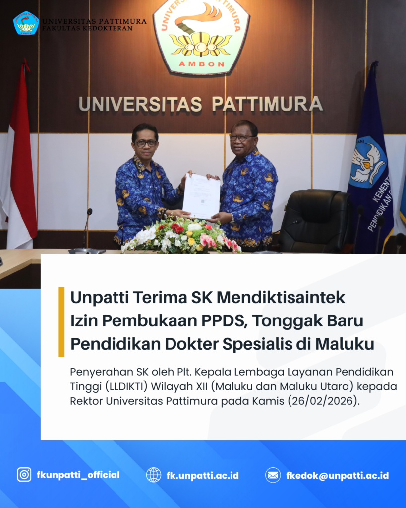 Universitas Pattimura (Unpatti) secara resmi menerima Surat Keputusan (SK) Menteri Pendidikan Tinggi, Sains, dan Teknologi (Mendiktisaintek) No. 140/B/O/2026 tentang izin pembukaan Program Pendidikan Dokter Spesialis (PPDS). Penyerahan SK dilakukan dalam sebuah agenda resmi yang berlangsung pada Kamis (26/02/2026). SK tersebut diserahkan oleh Plt. Kepala LLDIKTI Wilayah XII (Maluku dan Maluku Utara), Prof. Dr. Saiful Deni,