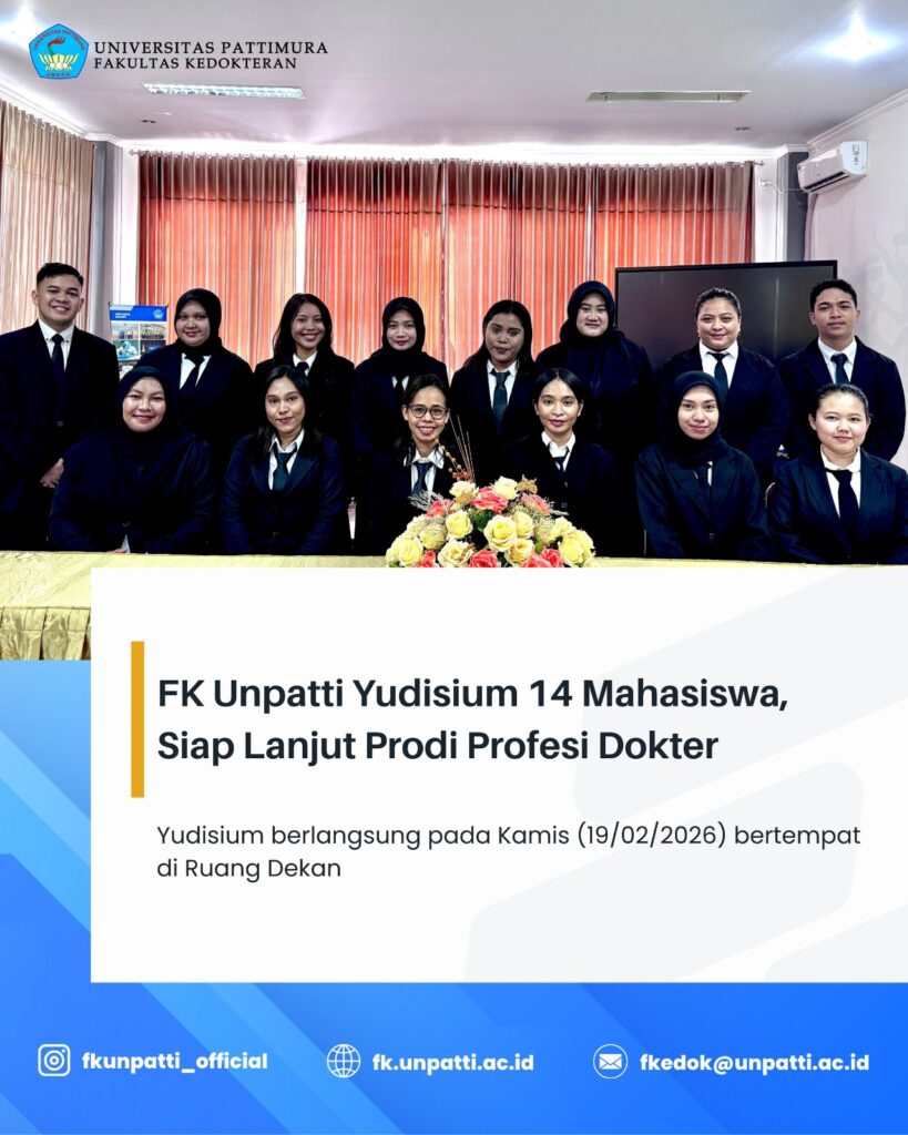 Fakultas Kedokteran Universitas Pattimura (FK Unpatti) menggelar Yudisium bagi 14 mahasiswa yang telah menyelesaikan pendidikan pada Program Studi (Prodi) Sarjana Kedokteran. Kegiatan Yudisium berlangsung pada Kamis (19/02/2026), bertempat di ruang Dekan FK Unpatti. Acara diawali dengan pembacaan Surat Keputusan (SK) Yudisium oleh Koordinator Prodi Sarjana Kedokteran, dr. Vebiyanti, Sp.P., M.Sc., kemudian dilanjutkan dengan prosesi Yudisium