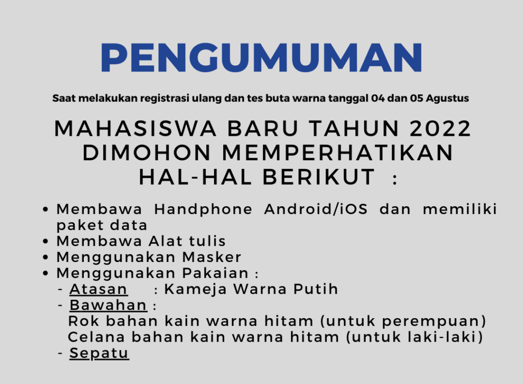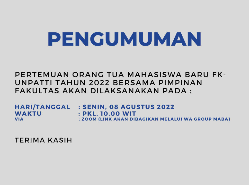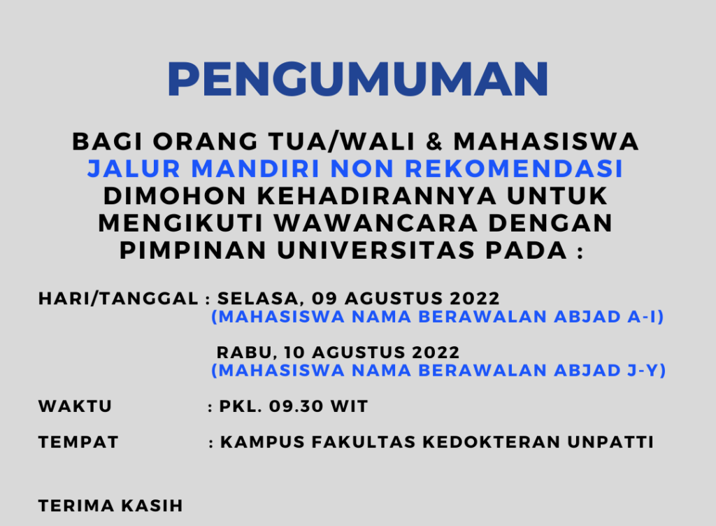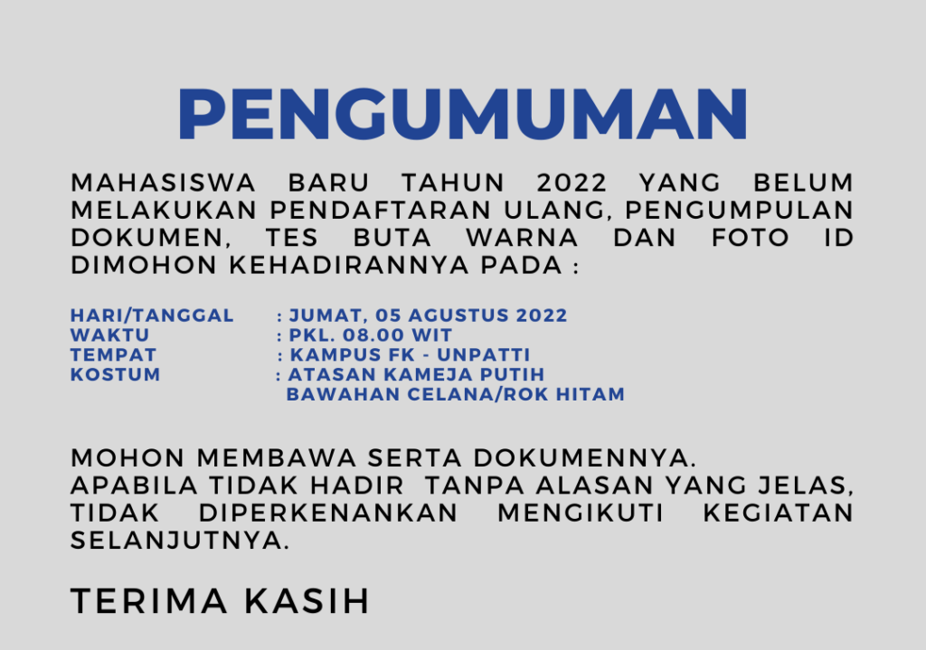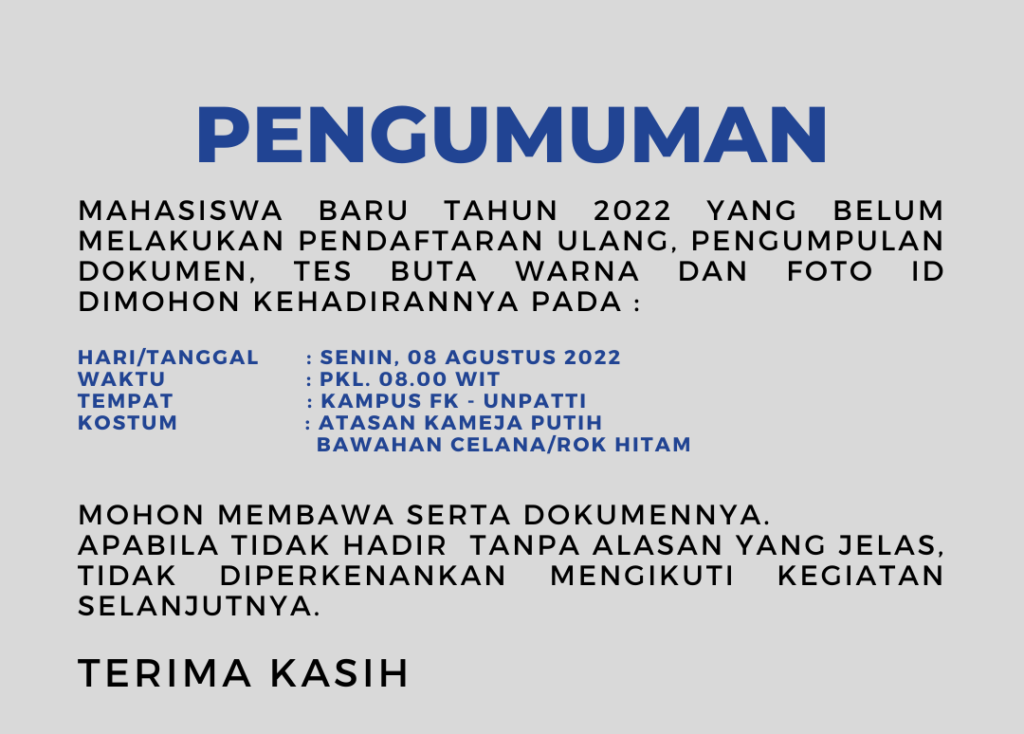 Sejumlah Mahasiswa Baru Fakultas Kedokteran (FK) Universitas Pattimura (UNPATTI) Tahun 2022 yang lulus melalui semua jalur seleksi melakukan pendaftaran ulang, pengumpulan dokumen pribadi, Tes Buta Warna dan Foto ID pada Kamis – Jumat (04-05/08/2022) di Gedung FK UNPATTI. Ini merupakan tahapan awal yang wajib diikuti semua mahasiswa baru FK.